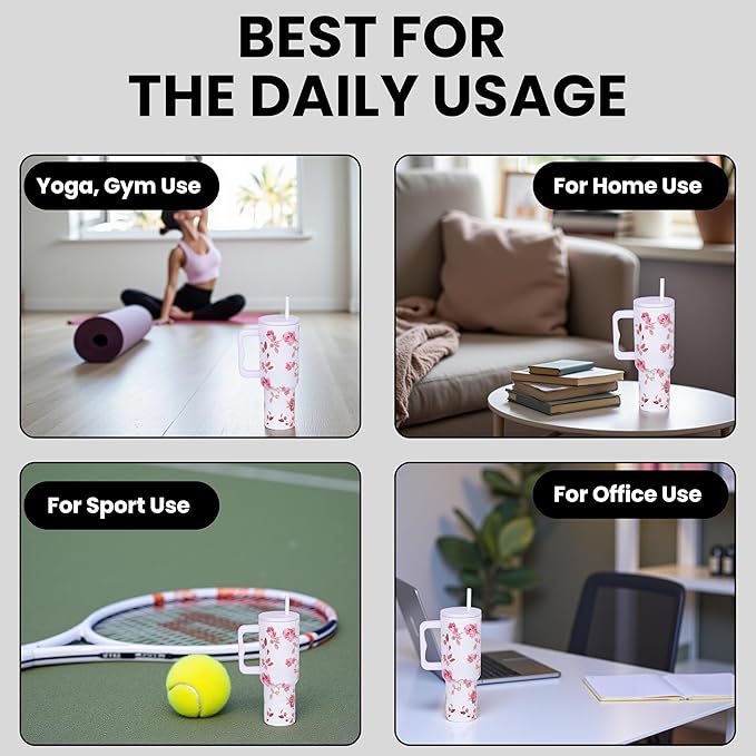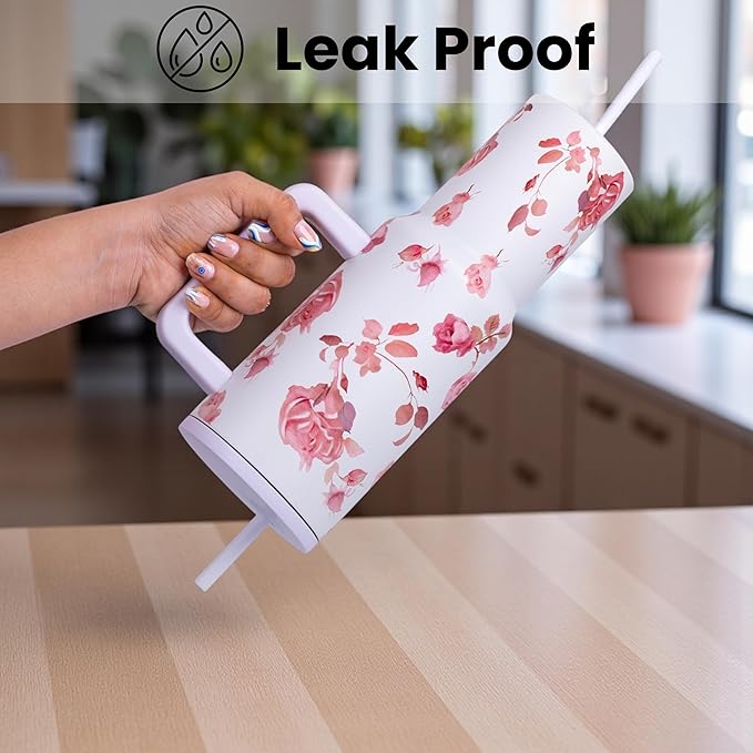 This 1200ml stainless steel vacuum insulated tumbler is designed for both performance and elegance. Built with double-wall insulation, it maintains beverage temperature for hours while preventing condensation. The spill-resistant 3-position lid with straw offers versatile and secure drinking options. Its large capacity ensures fewer refills, while the floral white rose pattern adds a premium, stylish touch suitable for work, workouts, or travel.