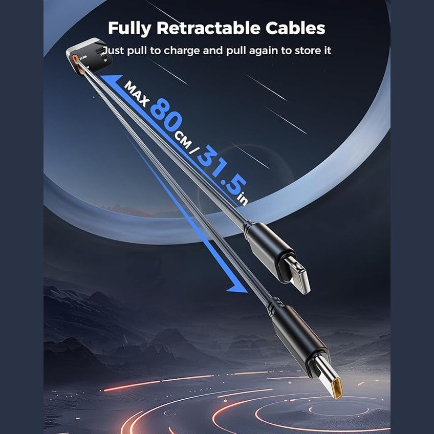 Equipped with USB ports, Type-C adapter, and a retractable charging cable to charge multiple devices at once.